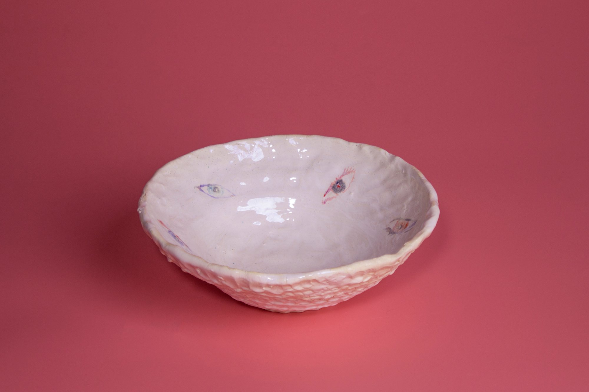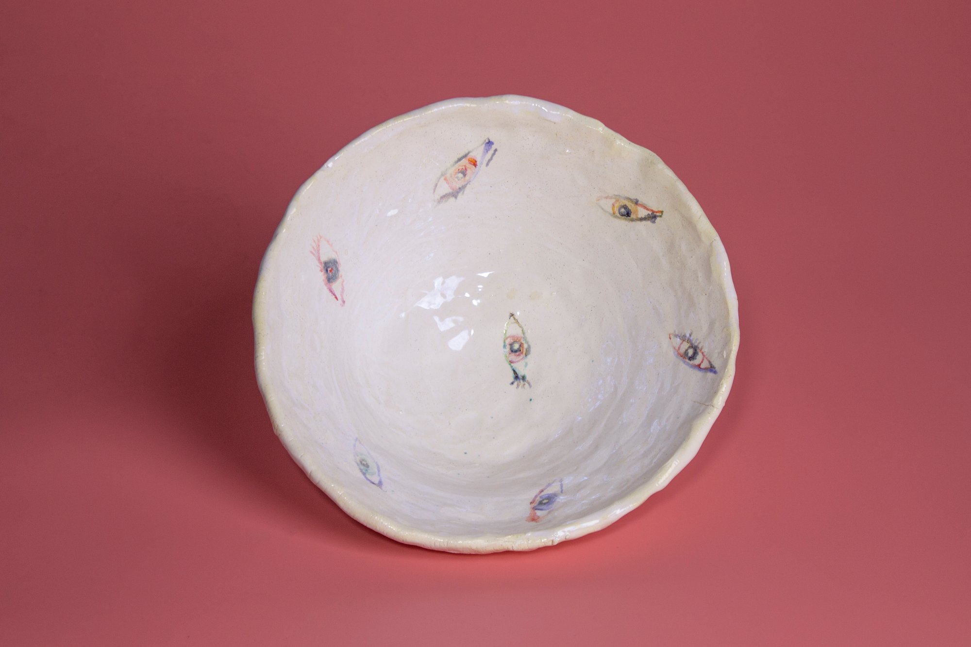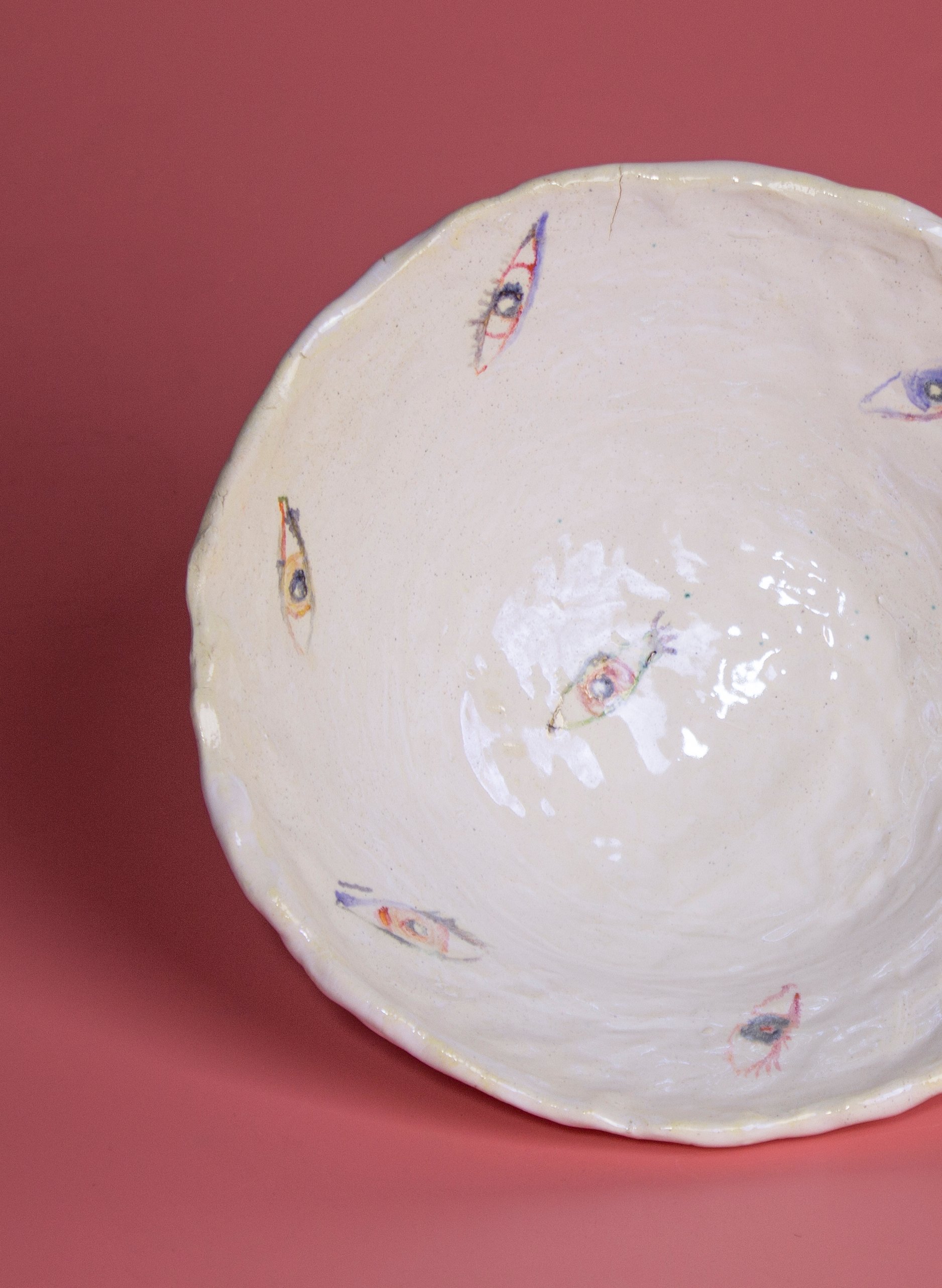 Ensaladera de loza. Dibujos de pigmentos y óxidos bajo cubierta. Esmalte irisado, cocido en baja temperatura.